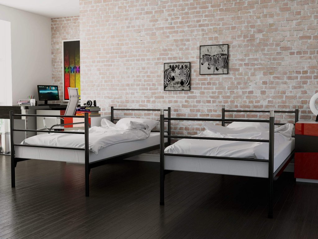 Moderná kovová poschodová posteľ Eleonora sa vyznačuje svojím jednoduchým, no štýlovým dizajnom a tiež funkčnosťou. Je vyrobená z kovu v čiernej farbe, pričom jej veľkou prednosťou je to, že sa dá rozložiť na dve samostatné lôžka. Medzi jej výhody patrí aj pevný odolný rám a stabilné lôžka. Disponuje praktickou bariérkou. Jednoduché a štíhle línie rámu sa vyznačujú moderným mestským dizajnom, ktorý je vhodný pre mladých energických ľudí a vďaka svojmu prevedeniu sa nábytok hodí do každého interiéru študentskej izby, internátov či hotelov. Kovový rám sa jednoducho čistí, ale aj rýchlo montuje a demontuje. Rebrík na posteli uľahčuje nastupovanie a vystupovanie z horného lôžka. Je univerzálny, takže ho môžete namontovať na pravú aj ľavú stranu postele.