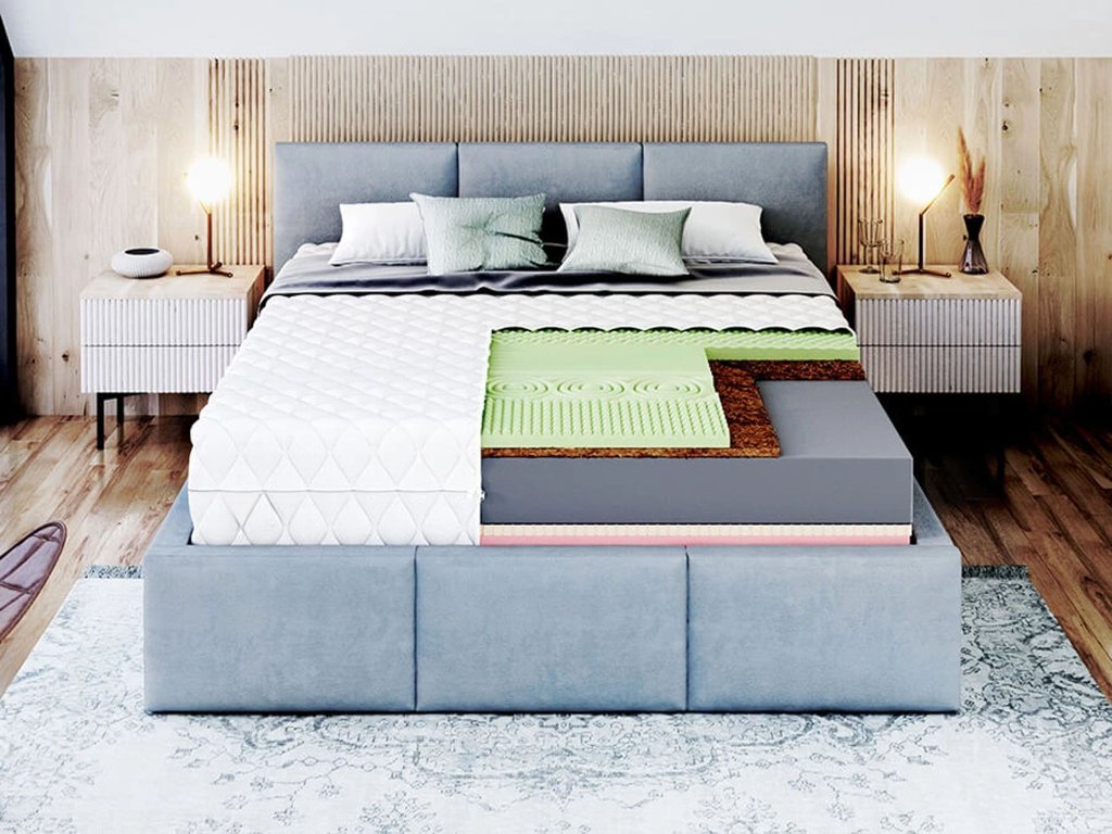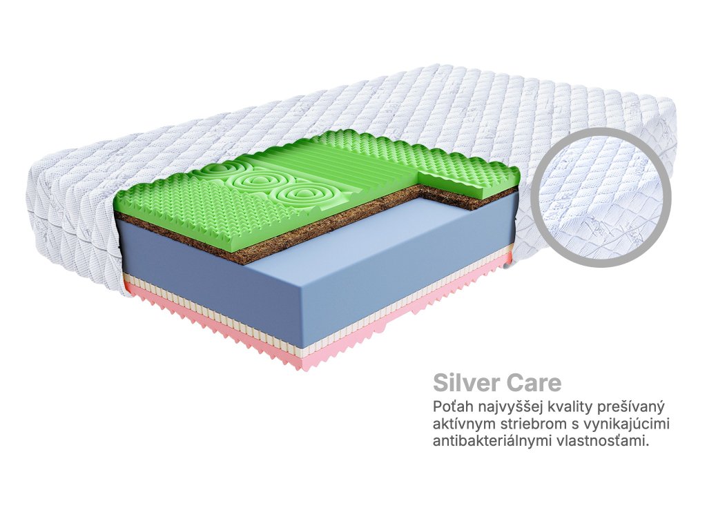 Materiálové zloženie: Polyuretánová pena, Profilovaná studená HR pena, Latex, Profilovaná pamäťová VISCO pena, Kokosová vrstva, Poťah