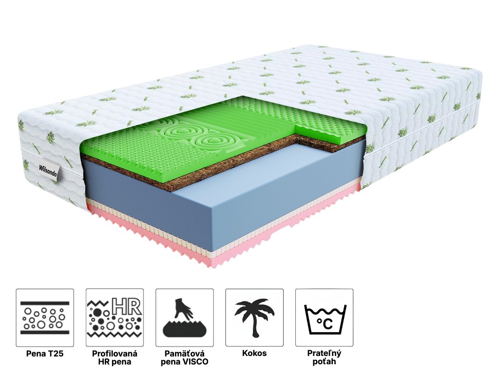 Inovatívny viacvrstvový penový matrac s kokosom, latexom a termoelastickou Visco penou. Pamäťová Visco pena reaguje na telesné teplo a tlak a tak ideálne kopíruje tvar tela. Kokosová a latexová vrstva má antialergické a antimikózne účinky. Profilovaná HR pena zabezpečí dokonalé prispôsobenie tvaru tela. Polyuretánová pena s vysokou elasticitou a pevnosťou sa nedeformuje, čím zabezpečuje vysokú životnosť matraca a kvalitu spánku.
