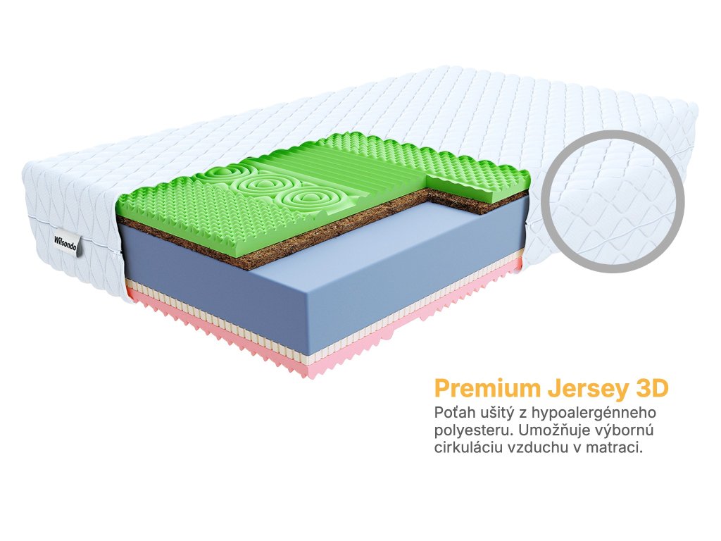 Inovatívny antialergický ortopedický penový matrac s kokosom, latexom a termoelastickou Visco penou. Pamäťová Visco pena reaguje na telesné teplo a tlak a tak ideálne kopíruje tvar tela. Kokosová a latexová vrstva má antialergické a antimikózne účinky.Profilovaná HR pena zabezpečí dokonalé prispôsobenie tvaru tela. Polyuretánová pena s vysokou elasticitou a pevnosťou sa nedeformuje, čím zabezpečuje vysokú životnosť matraca a kvalitu spánku.