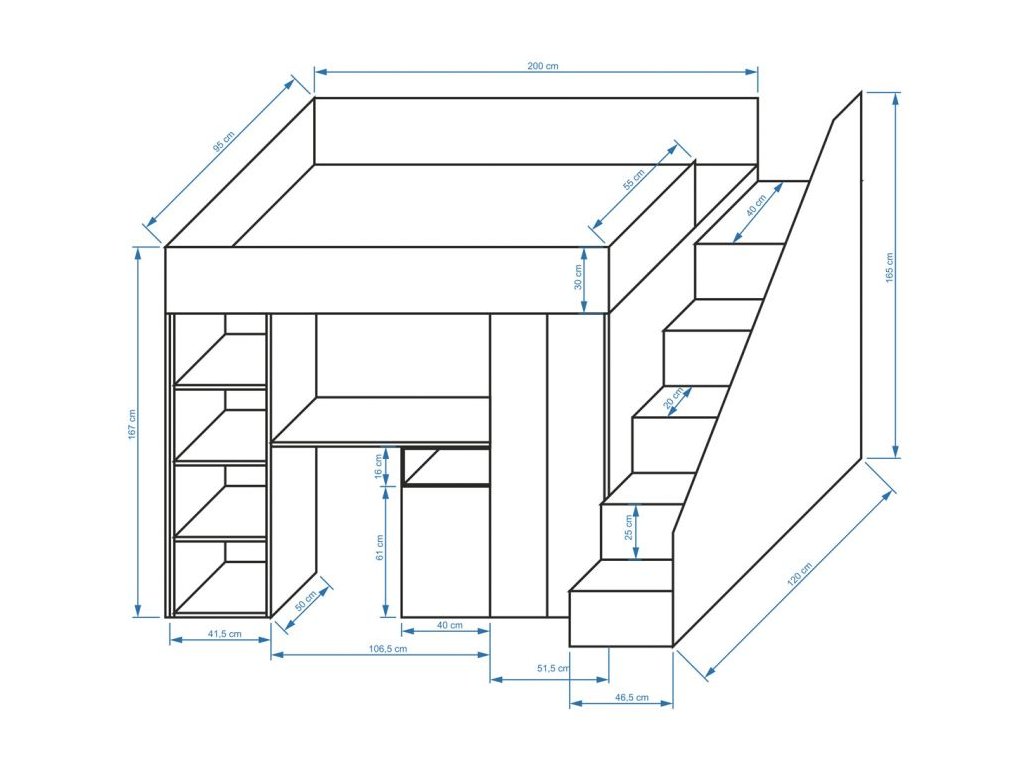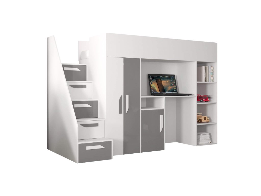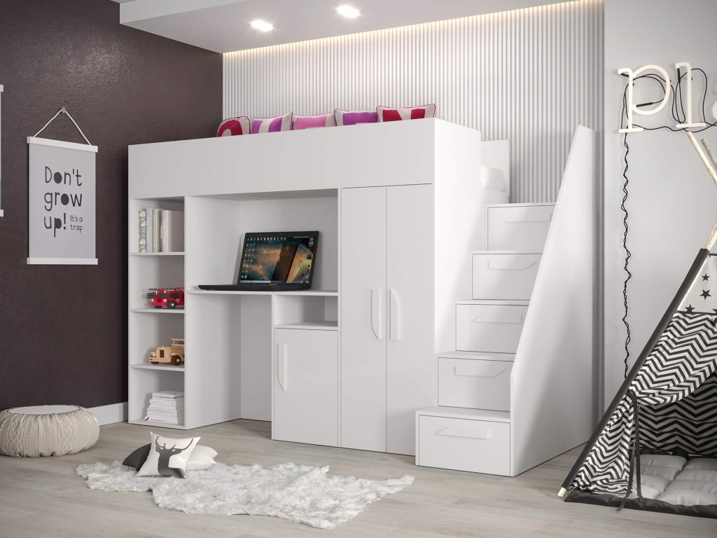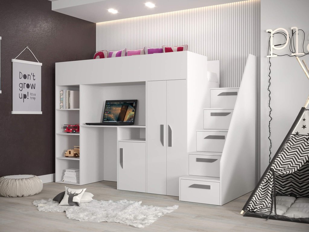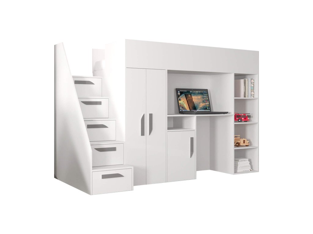 Ak hľadáte spôsob ako vyriešiť málo miesta v detskej izbe, multifunkčná posteľ Party 14 je to správne riešenie. Zakúpením klasickej detskej postele zabezpečíte pre Vaše dieťa len miesto na spanie. Táto posteľ ponúka oveľa viac - lôžko, písací stôl (s dvomi policami), šatníkovú skriňu (s tromi policami) a päť uložných šuplíkov.