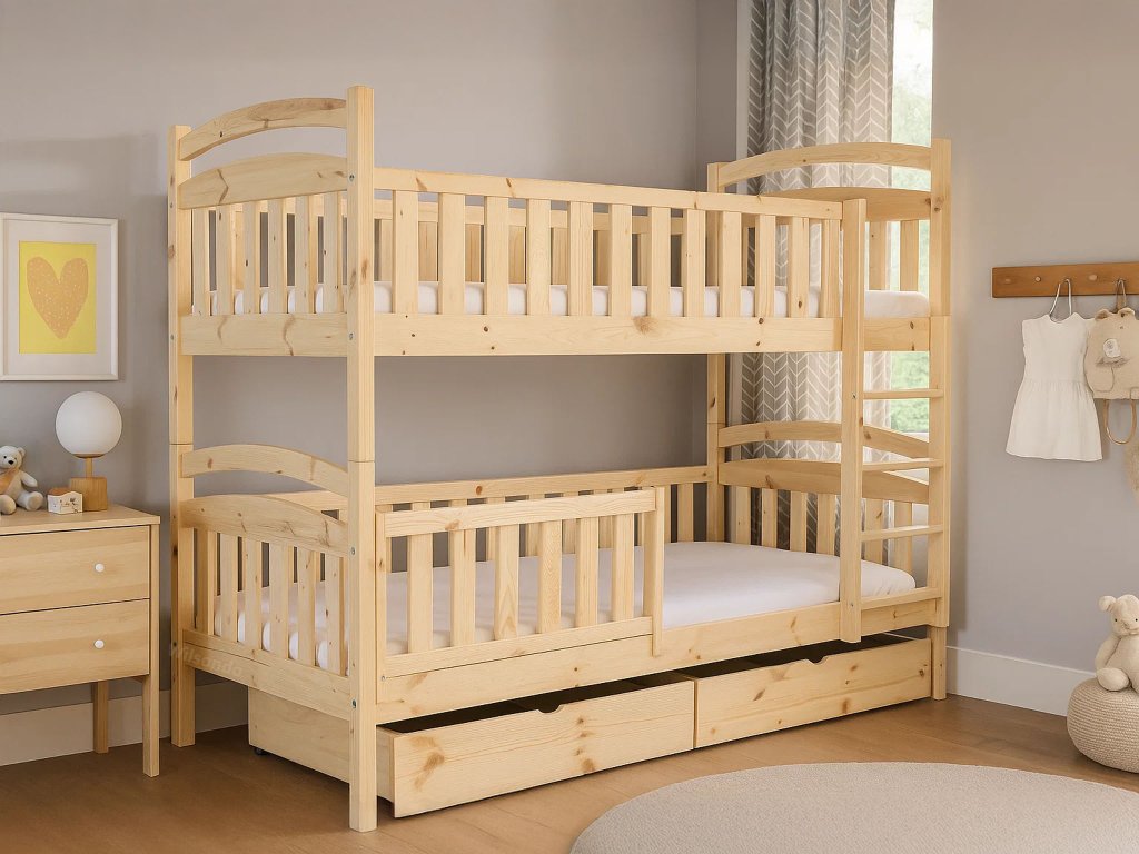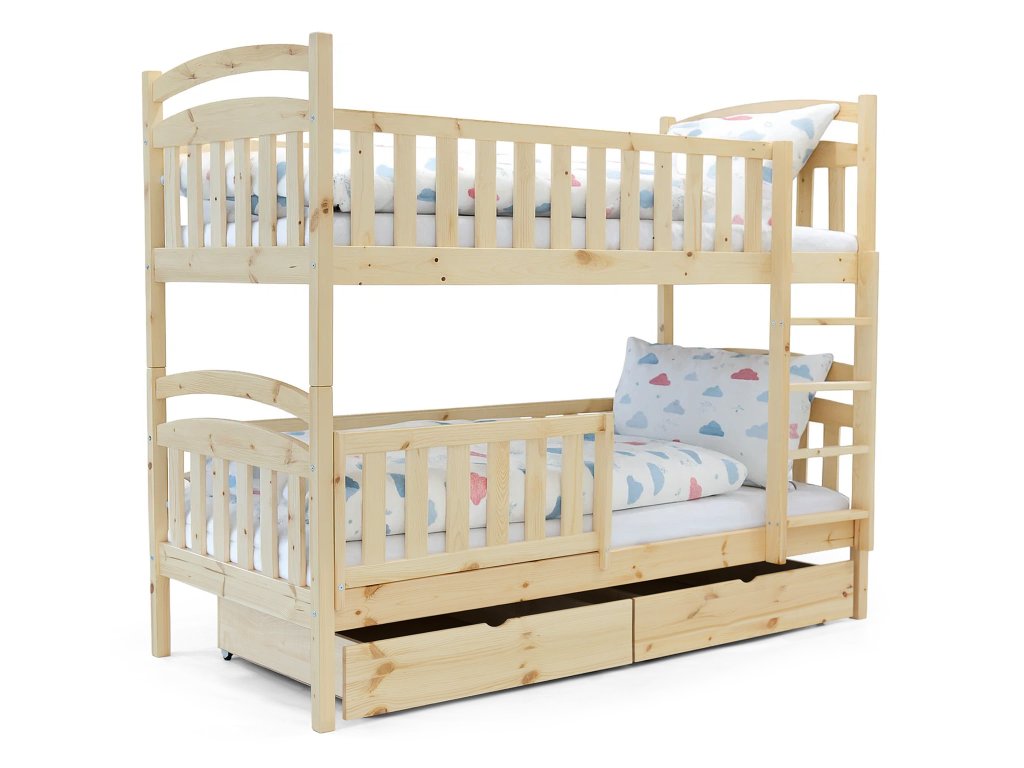 Poschodová posteľ Paula 7 je tou správnou voľbou do malých detských izieb. Súčasťou postele sú aj dva úložné priestory, ktoré Vám pomôžu udržať poriadok v izbe. Navyše sú na kolieskach, a tak chránia Vašu podlahu pred poškodením. Posteľ je vyrobená z masívneho borovicového dreva, a preto má veľmi pevnú a stabilnú konštrukciu. Je lakovaná ekologicky nezávadným lakom. Posteľ je možné rozložiť na dve samostatné lôžka. Spoj postelí je riešený kolíkmi, a tak môžete posteľ veľmi rýchlo a jednoducho zložiť alebo rozložiť. Rebrík k posteli je obojstranný, čo znamená, že posteľ môžete namontovať s rebríkom na pravej alebo ľavej strane. Rebrík sa vyznačuje širokou skosenou nástupnou plochou, a tak dieťaťu zabezpečuje pohodlné vyliezanie a zliezanie z postele. Poschodové postele vám ušetria veľa miesta v izbe, ktoré môžu vaše deti využiť na hranie. Bariéra na spodnú časť postele je v cene.