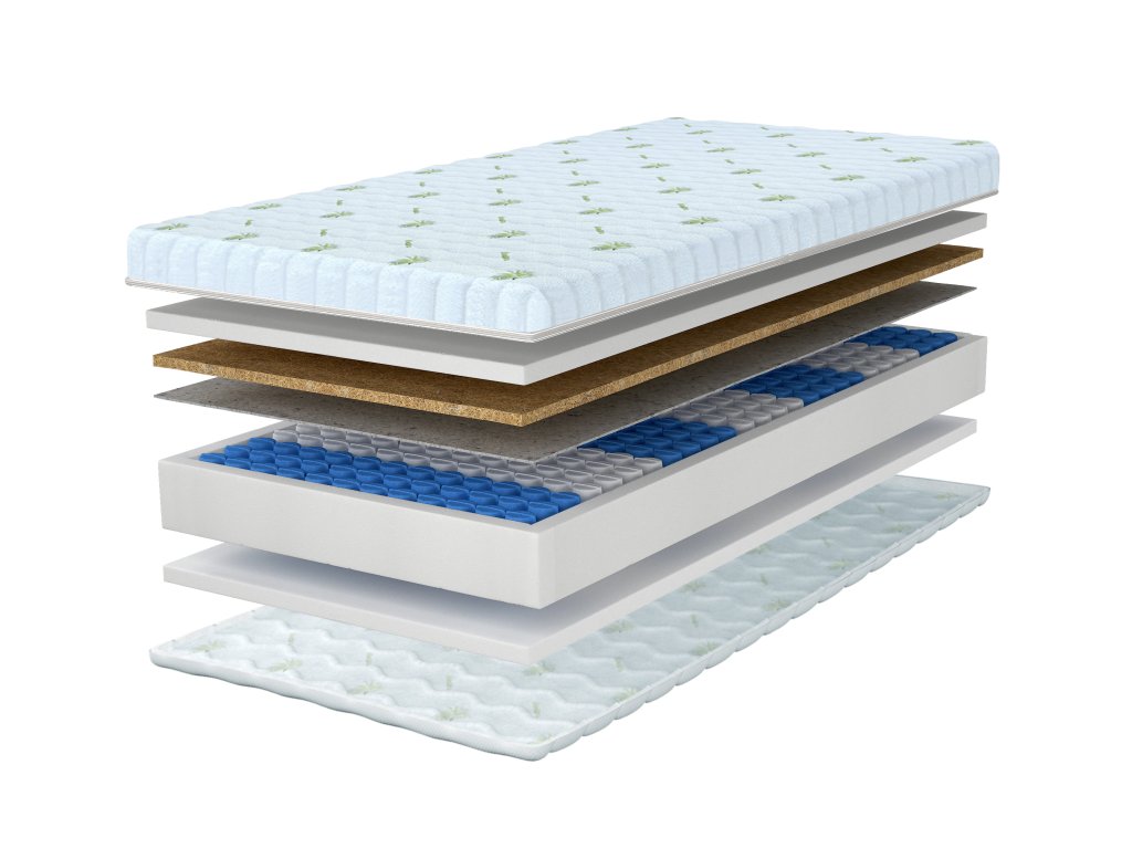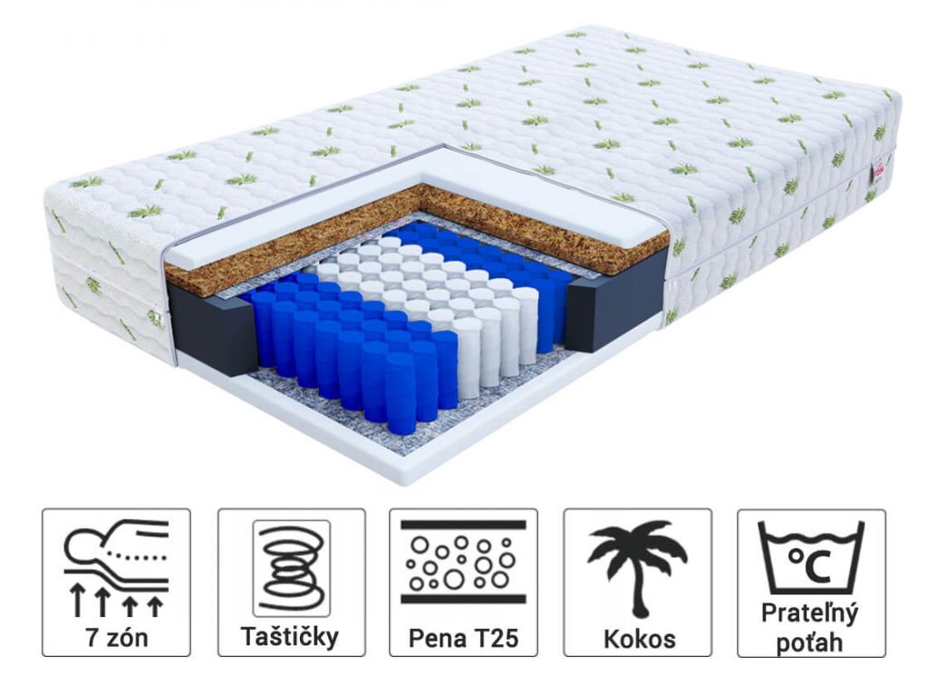 Materiálové zloženie: Filc, NanoHARD taštičkové pružiny, Polyuretánová PUR pena s hustotou 25 kg/m3, Poťah, Kokosová vrstva