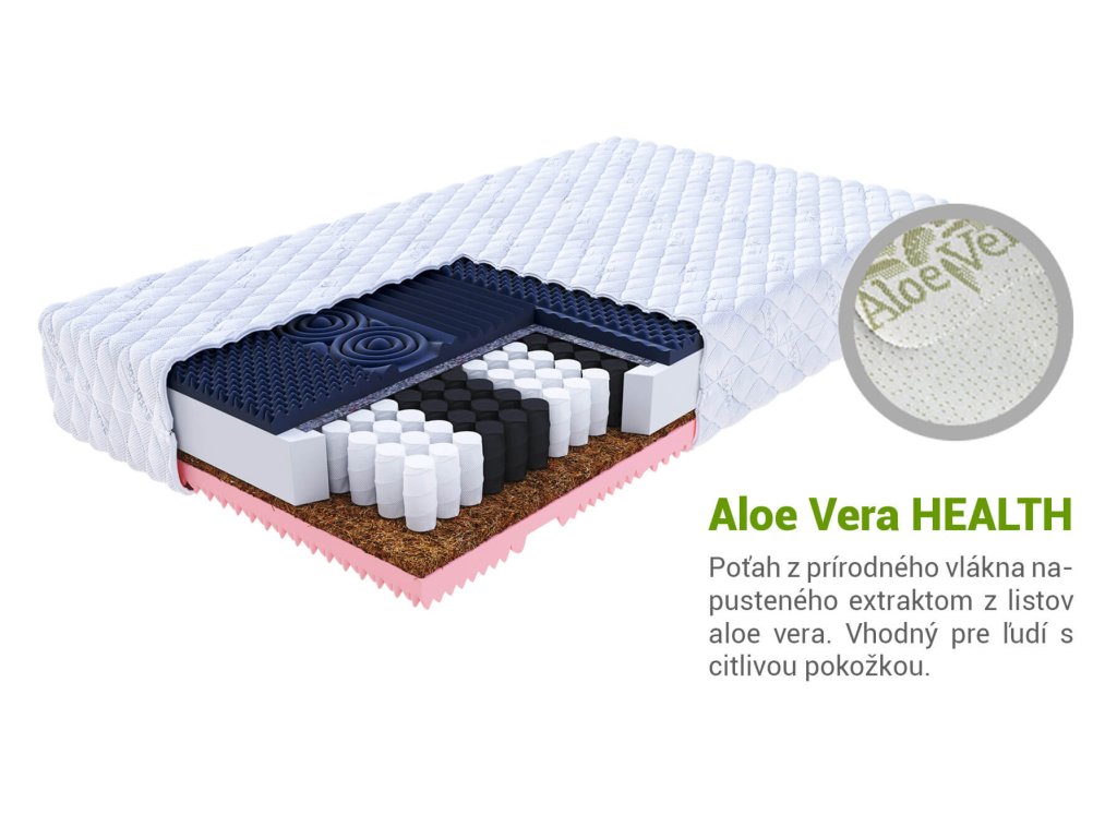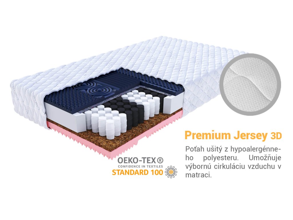 Materiálové zloženie: Polyuretánová pena, Taštičkové pružiny, masážna studená HR pena, pamäťová pena Visco, kokos, poťah