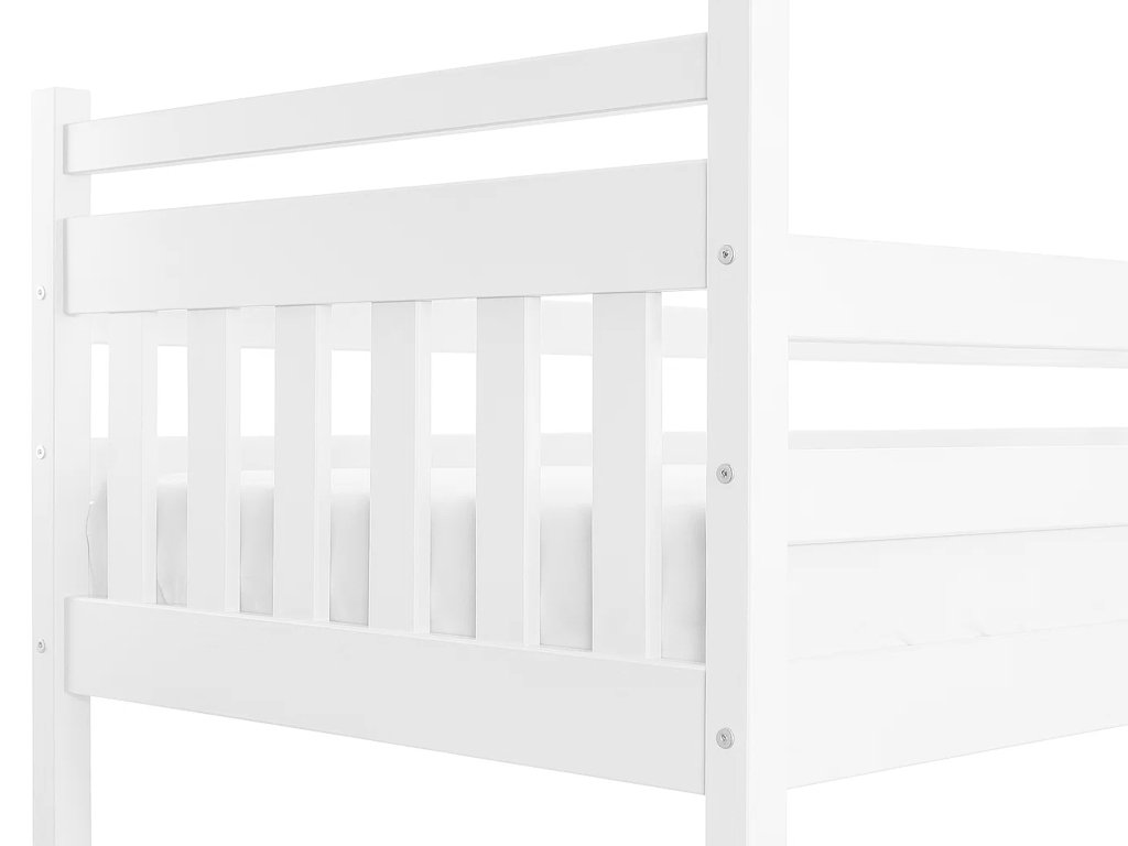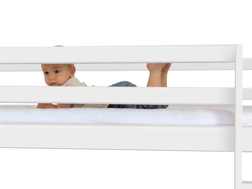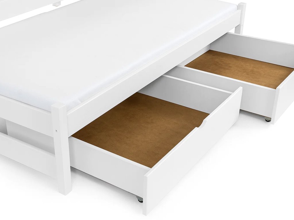 Biela poschodová posteľ Petra 5 je skvelou voľbou, ak hľadáte posteľ, ktorá Vám ušetrí miesto v detskej izbe. Vďaka výsuvnej prístelke Vám vznikne tretie plnohodnotné lôžko. Posteľ je vyrobená z masívu borovice a má pevnú konštrukciu. Poschodová posteľ je 3x lakovaná ekologickým lakom. Rebrík je obojstranný, to znamená posteľ je možné zmontovať s rebríkom na pravej alebo ľavej strane. V prípade potreby môžete posteľ rozložiť na dve samostatné lôžka. Súčasťou poschodovej postele sú dva hlboké úložné boxy. Boxy sú na umelých kolieskach, aby Vám nepoškodili podlahu. Nie sú upevnené, čiže je s nimi veľmi ľahká manipulácia. Na spodnom lôžku je bariérka, ktorá je súčasťou postele a chráni dieťatko pred vypadnutím z postele. Úložné priestory nevypĺňajú celý priestor pod posteľou. Medzi nohami postele a úložnými boxami je väčšia medzera ako je znázornené na fotografii.