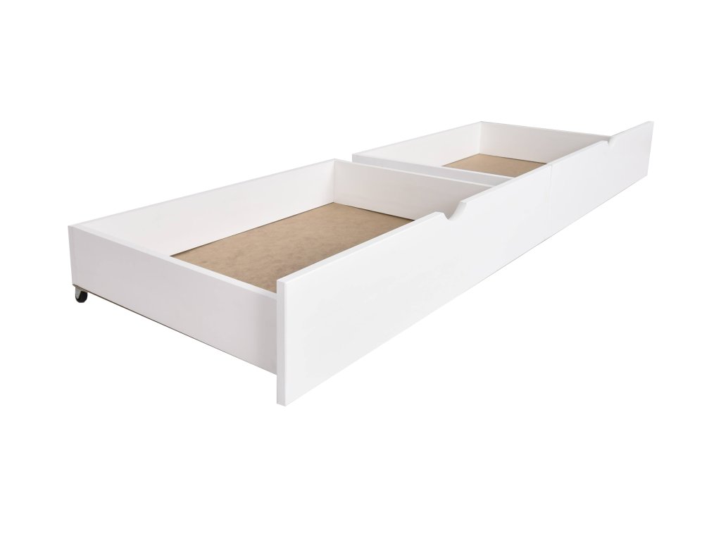 Elegantné biele úložné boxy ponúkajú nový odkladací priestor. Priestranné úložné boxy pod poschodovú posteľ Paulína, alebo domčekovú posteľ Pery. Úložné boxy sú pre zjednodušenie manipulácie na kolieskach. Predná doska šuflíkov je vyhotovená z masívneho borovicového dreva, bočné dosky z laminovanej DTD a dno šuflíka tvorí sololit.